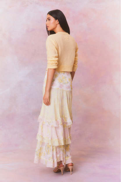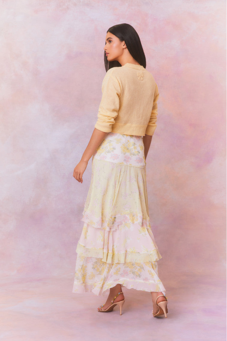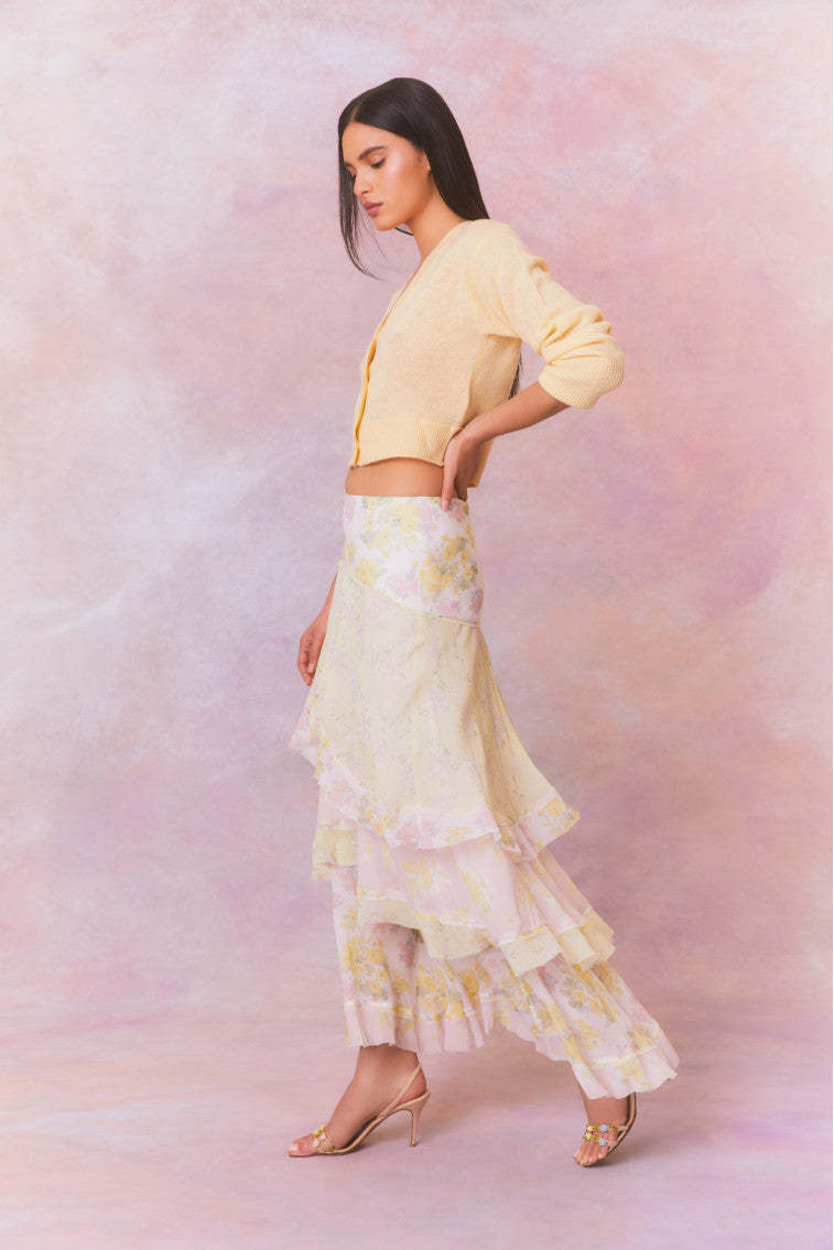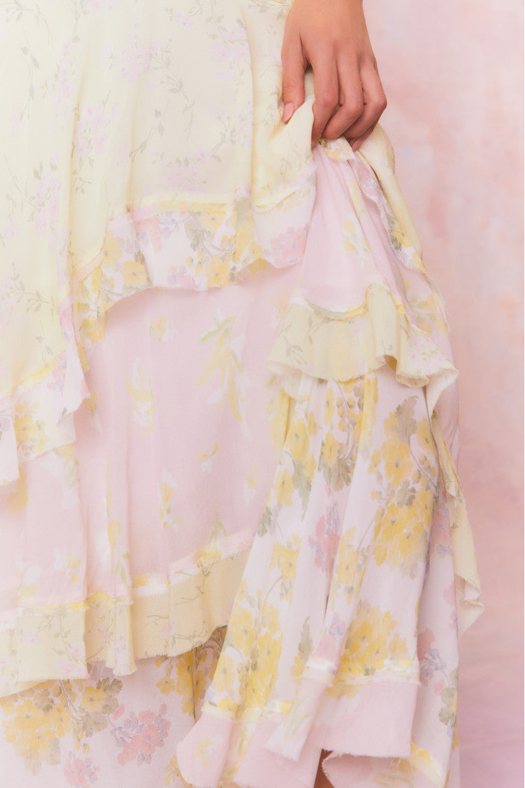 Romance found in the Ruella Skirt. This ethereal maxi stuns with a chiffon fabric featuring a feminine mixed print all over and a delicate bias strip for added depth. The high-to-low maxi skirt features a blend of asymmetrical ruffles all over.