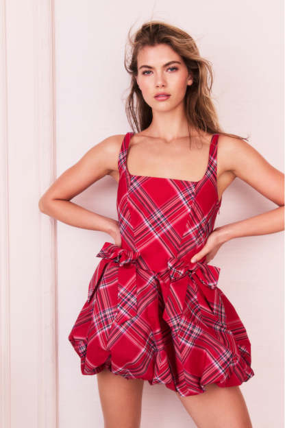 Festive and flirty in the Ruelle Dress. This holiday party mini debuts in a spirited. yarn-dyed tartan taffeta fabric with a gold lurex throughout to give it our signature OhMollys shimmer. Playful and pretty. this piece begins with a scoop neckline above a bustier bodice that releases into a gorgeous. 80s-inspired bubble skirt. The dress is complete with two placed at the hips for a feminine finish.