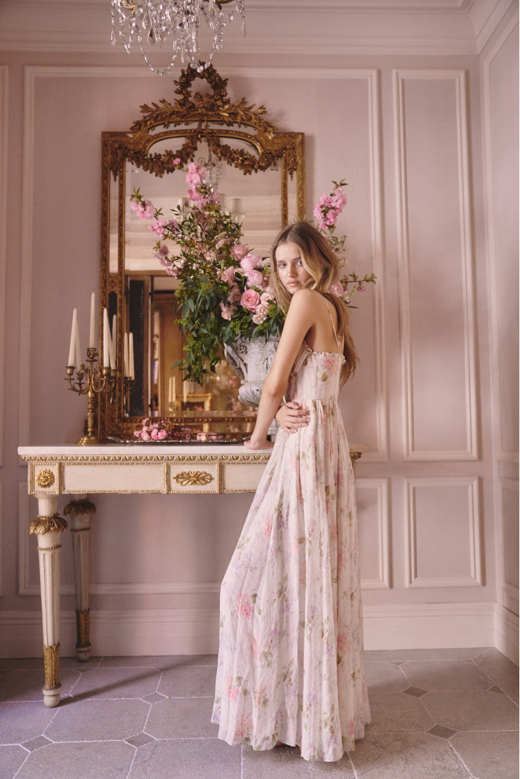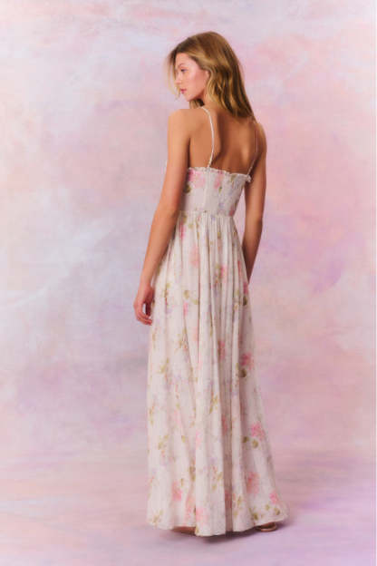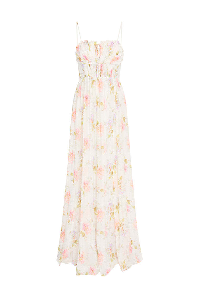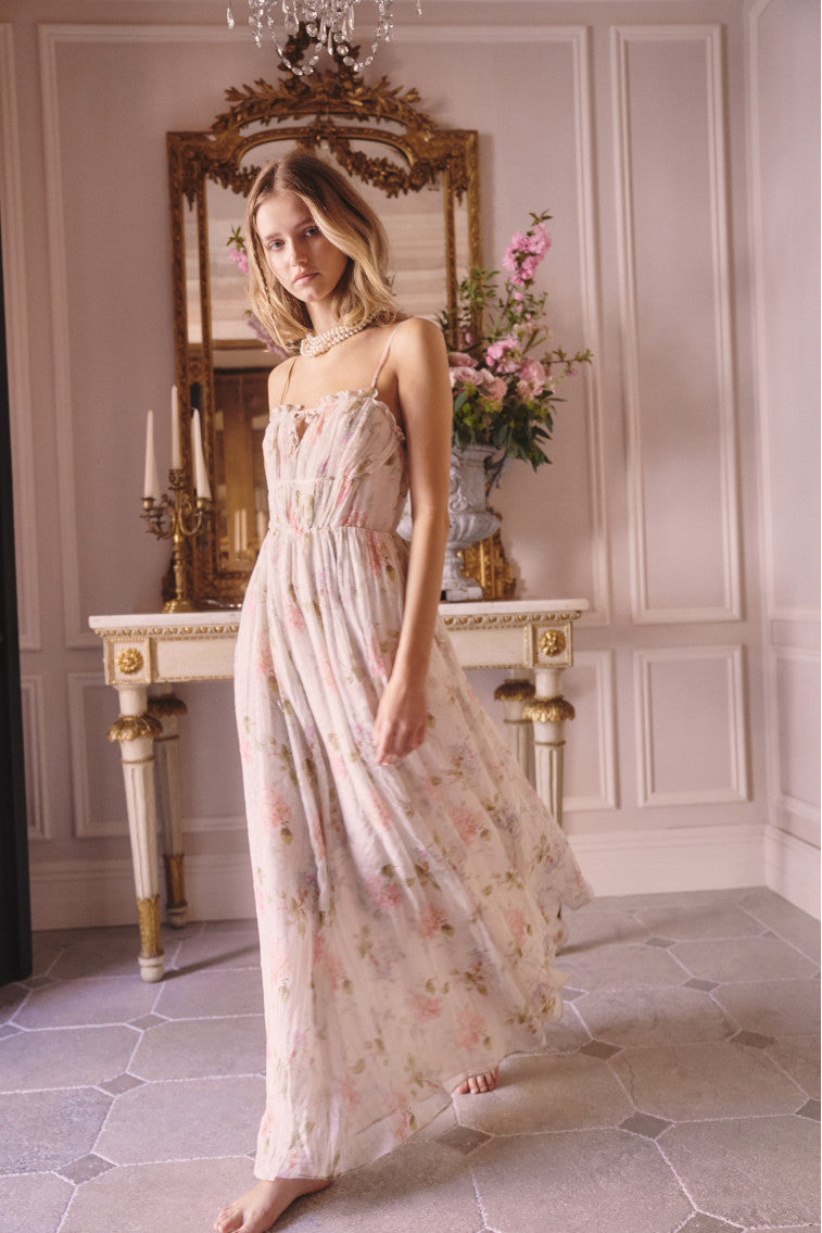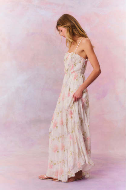 So in love with the Santee Dress. This stunning maxi is designed from a lurex chiffon fabric printed with a gorgeous large scale flower all over. A vintage-inspired bodice is highlighted with ruched detailing for pretty texture that releases at the top with ruffle detail at the neckline. The piece is finished with a sweeping shirred skirt and a smocked back for an easy and comfortable fit.