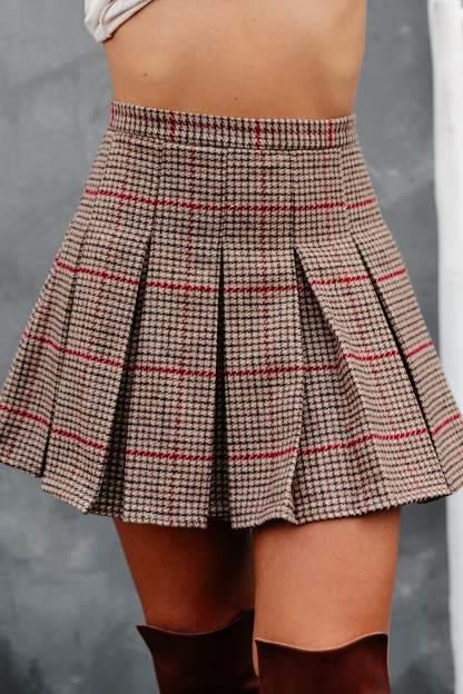 Dress Smartly With This Camel & Red. Pleated Plaid Mini Skirt!
