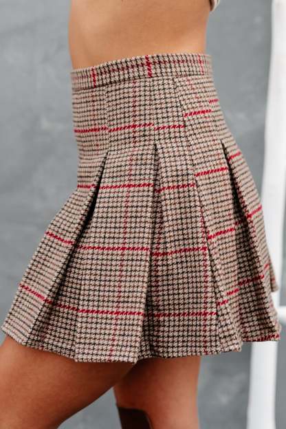 School Girl Crush Pleated Plaid Mini Skirt (Camel/Red Plaid)