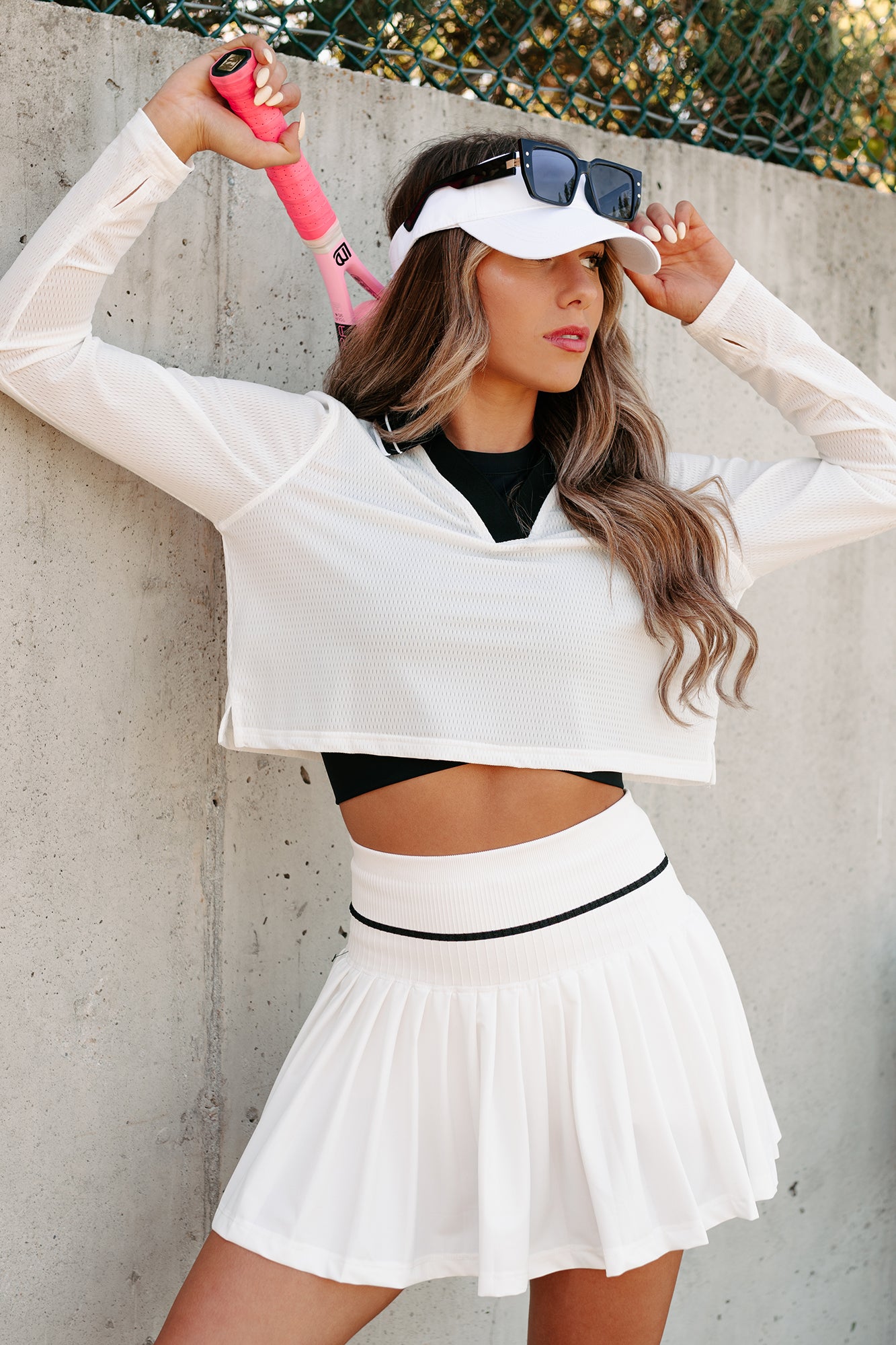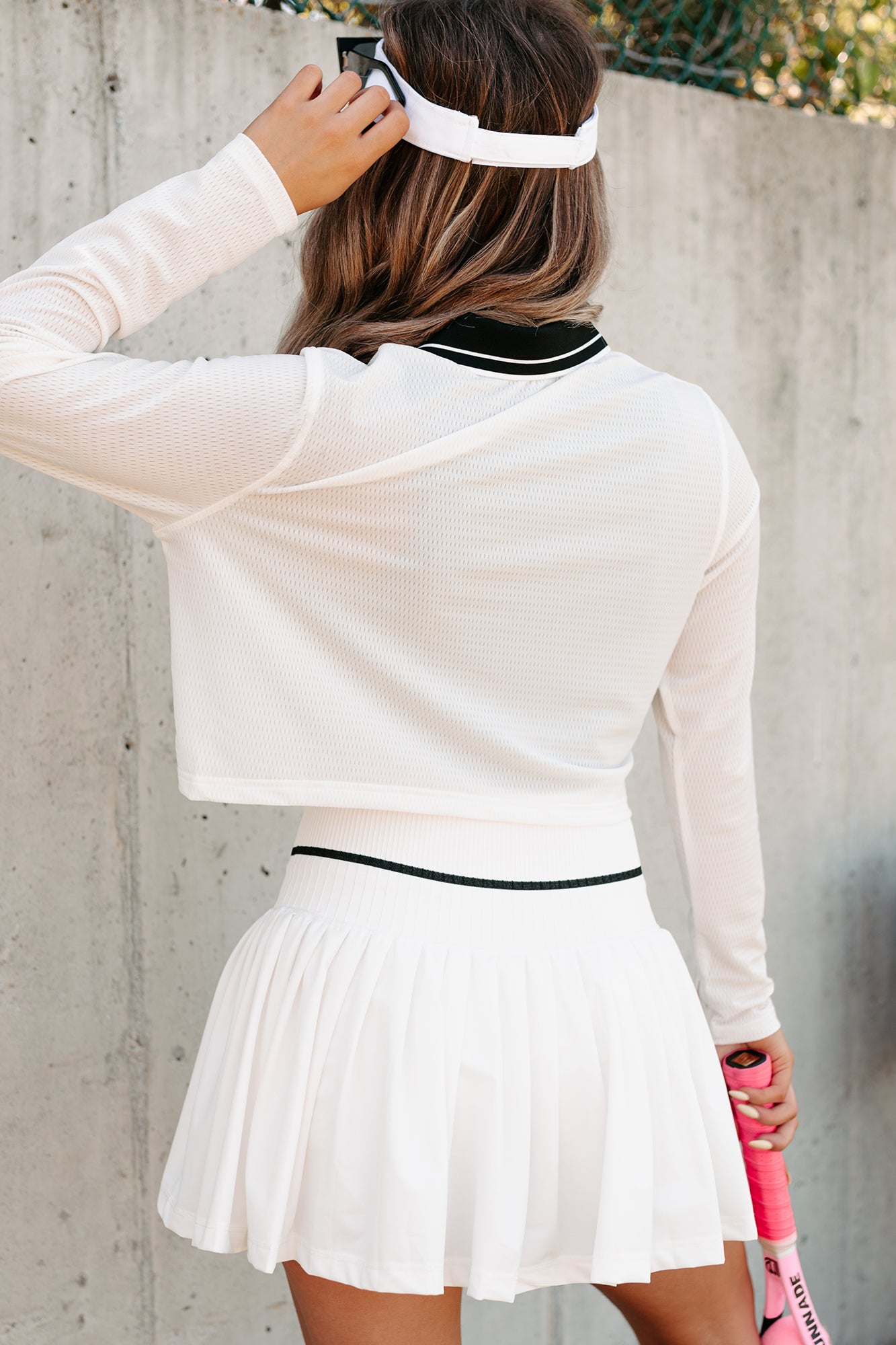 - Bottoms: Active/Tennis Style Skirt. Knit Waistband With Stripe Detail