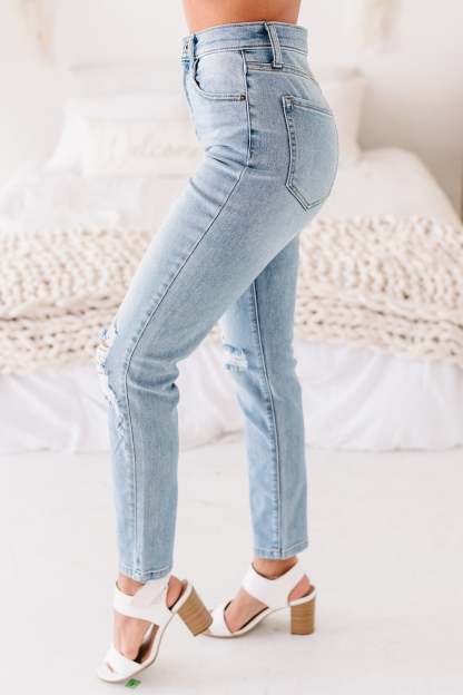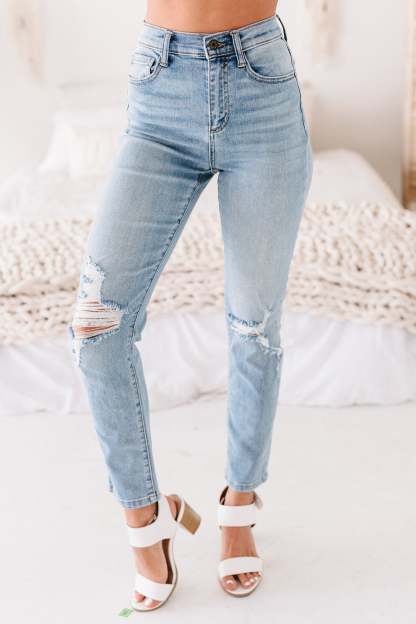 Get Back Into The 90's Style With These Medium Light. High Rise. Distressed. Slim-Straight Leg Jeans!