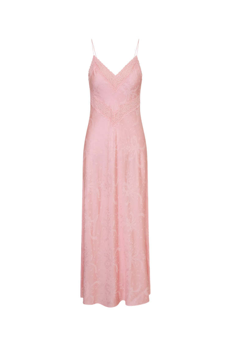 Everyone's favorite Serita Dress is back and flirtier than ever. This time. she arrives in a silk charmeuse jacquard fabric giving this piece a drapey. yet elevated wear. The stunning slip dress features gorgeous contrasting lace at the neckline and waist giving this piece a feminine silhouette. The lace is backed with a bit of chiffon for a Glamorous finish.