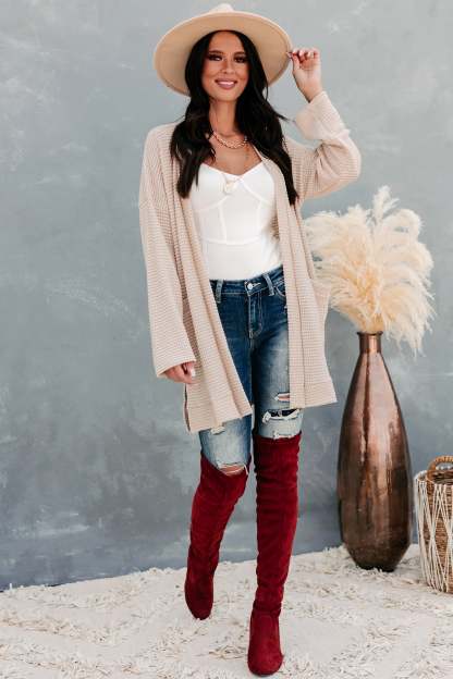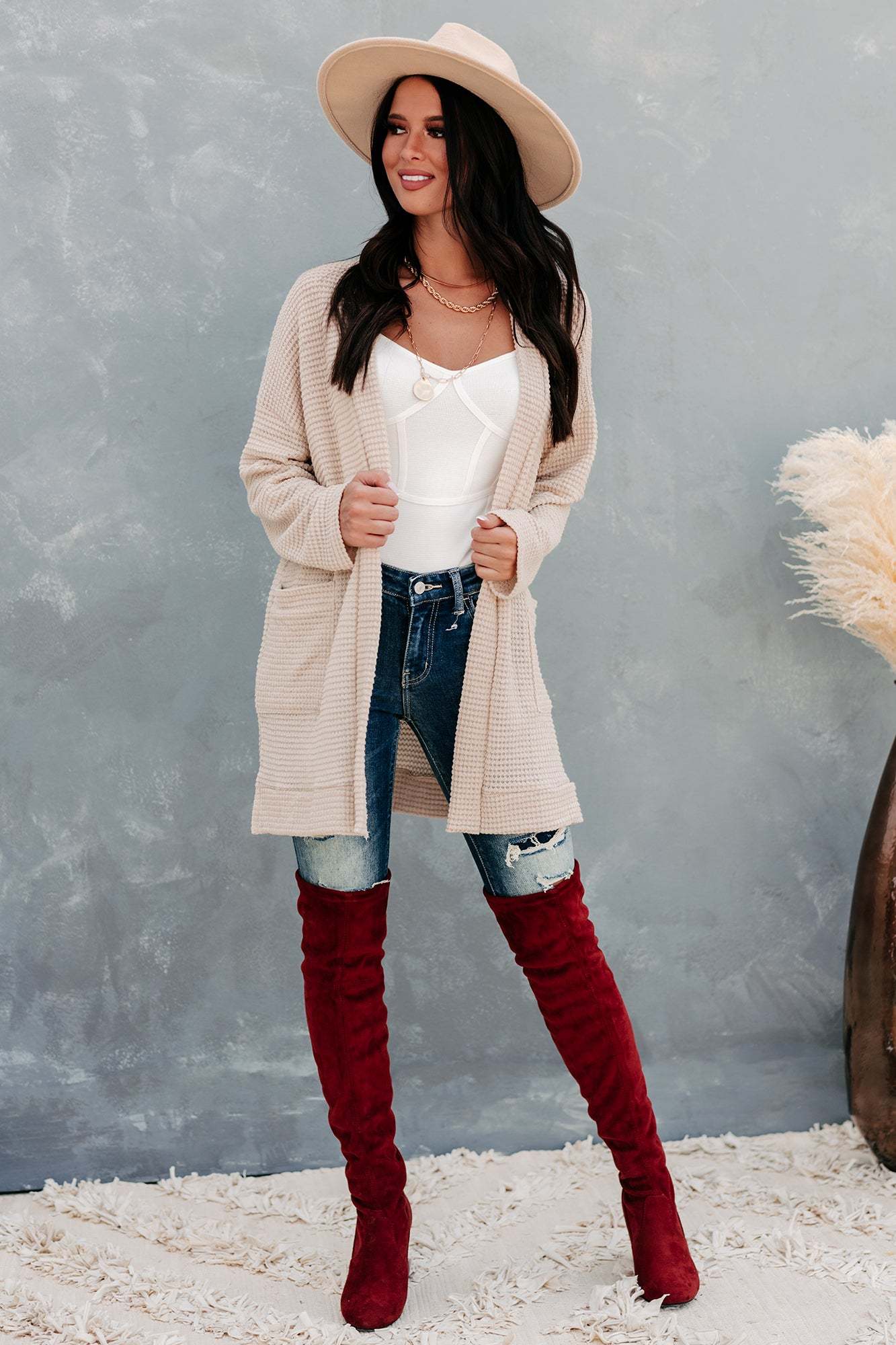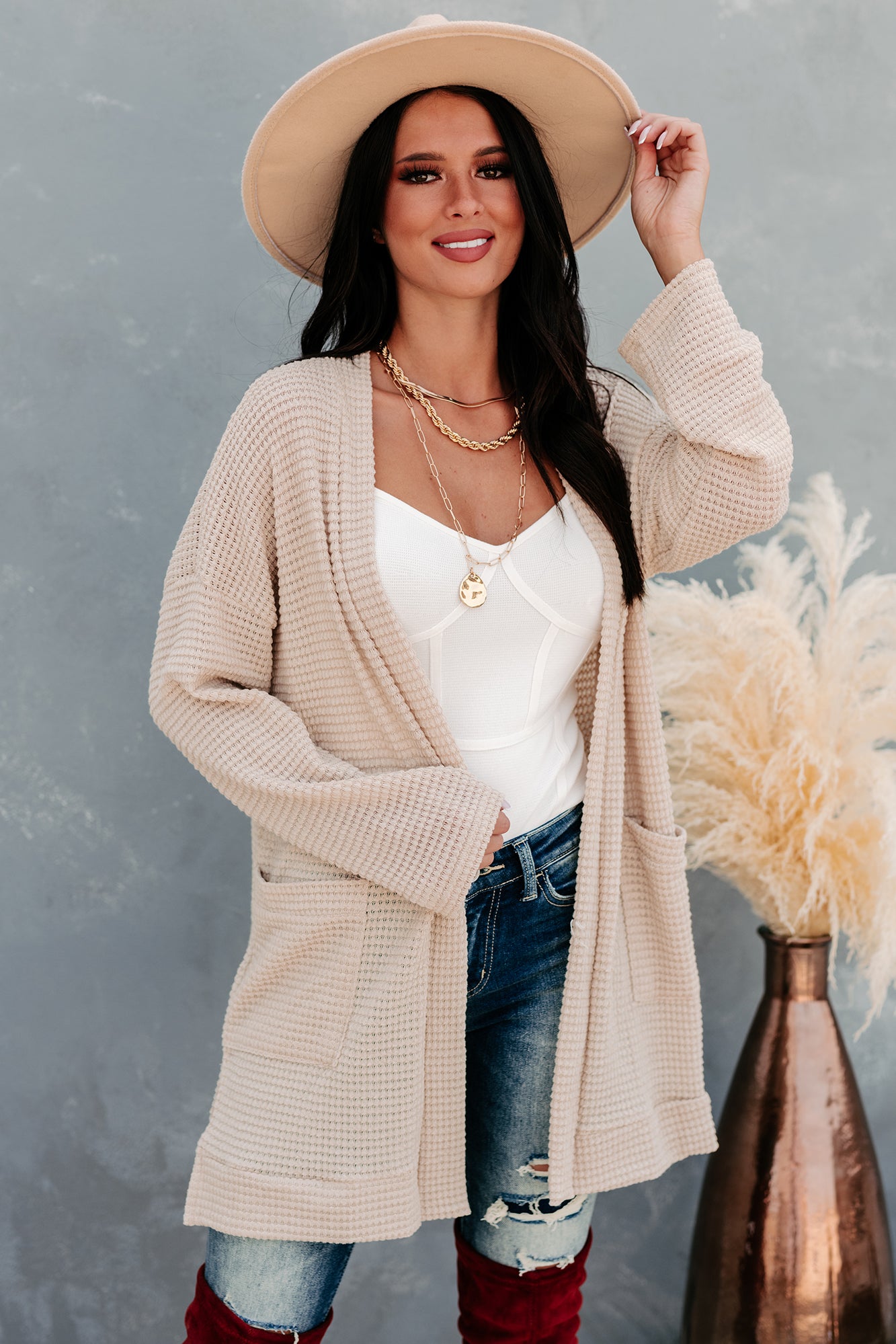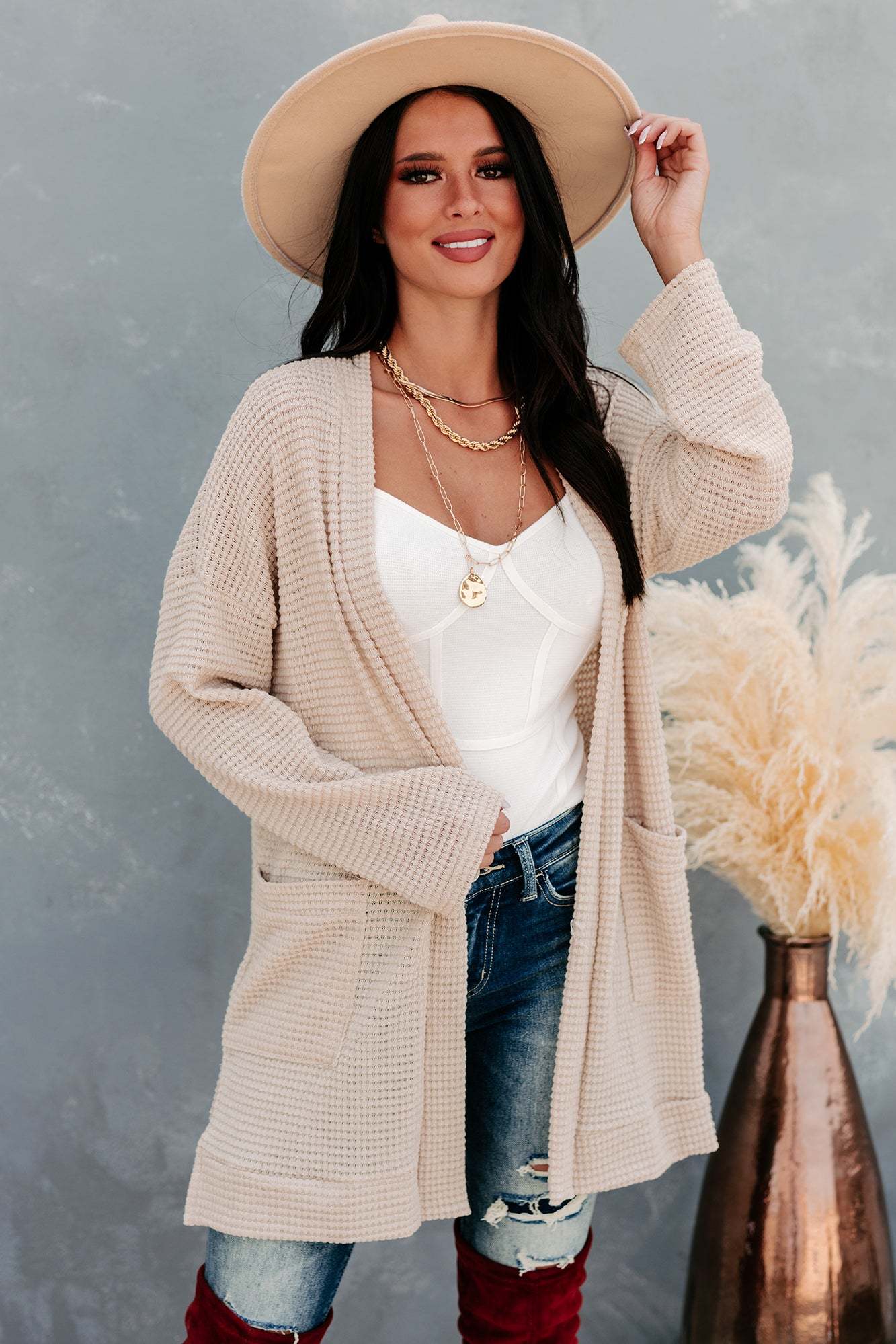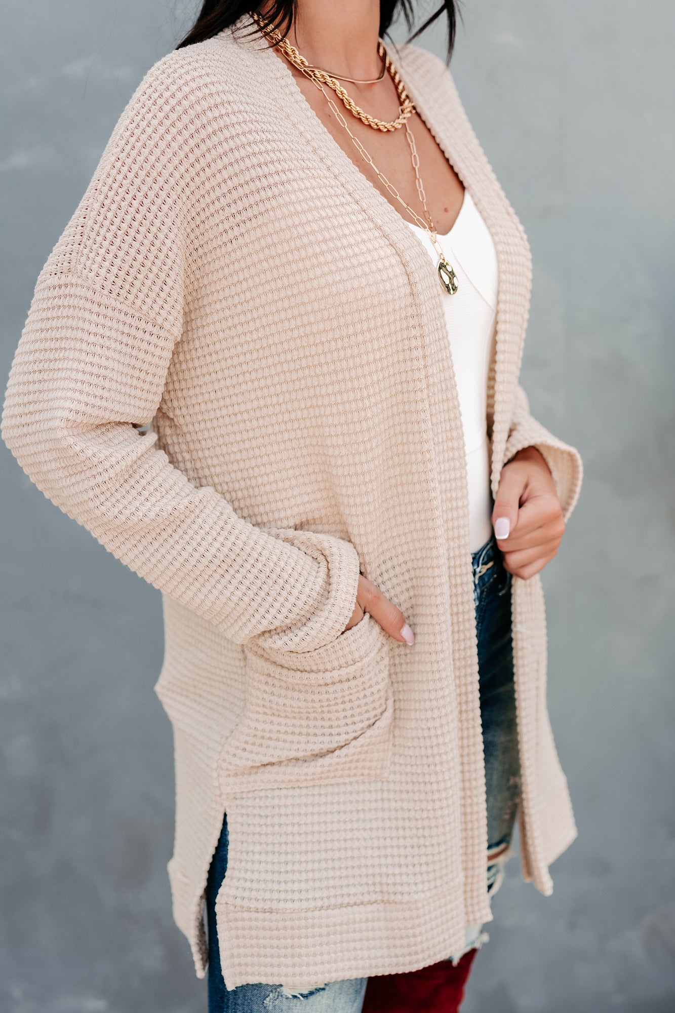 Transition Into Cooler Weather With This Cream. Open Front. Waffle Knit Cardigan!