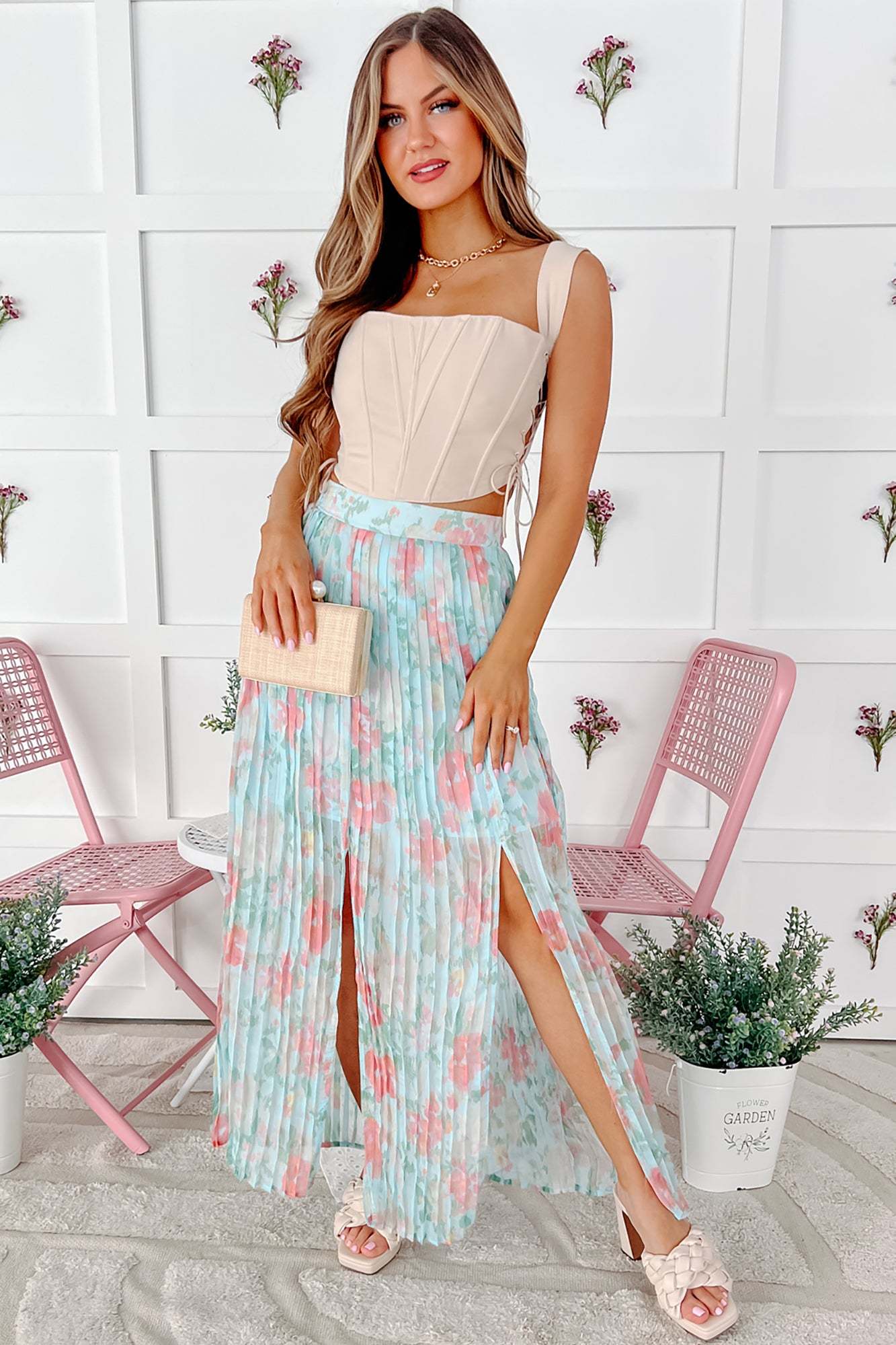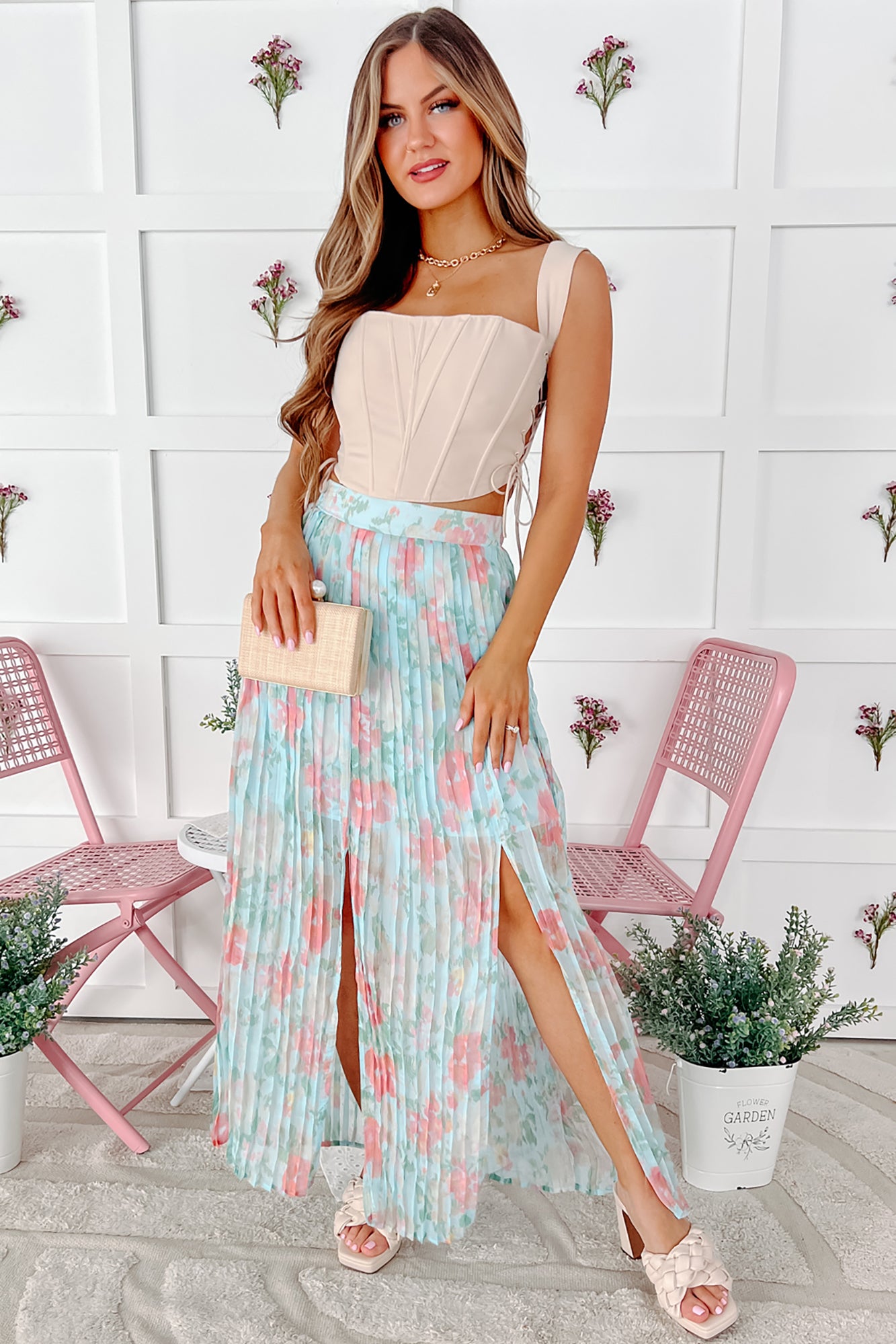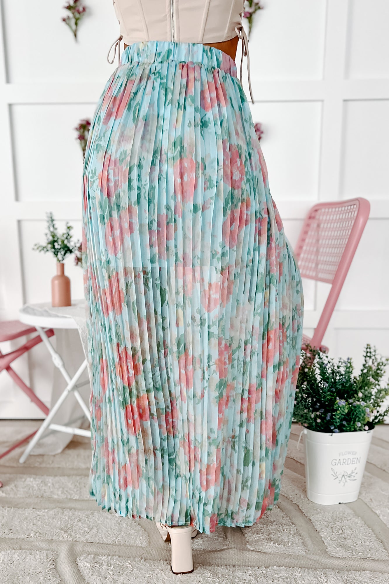 Springtime Perfection Pleated Floral Midi Skirt (Blue Multi)