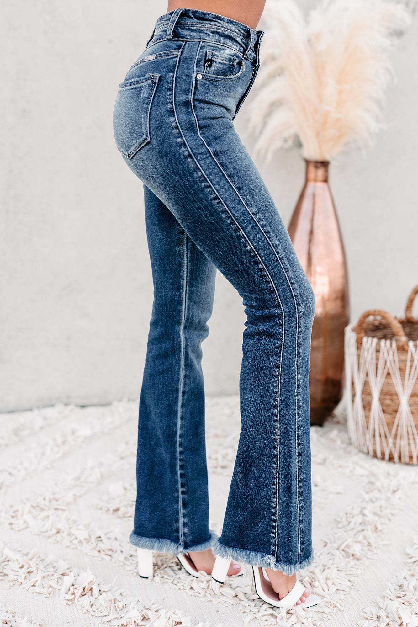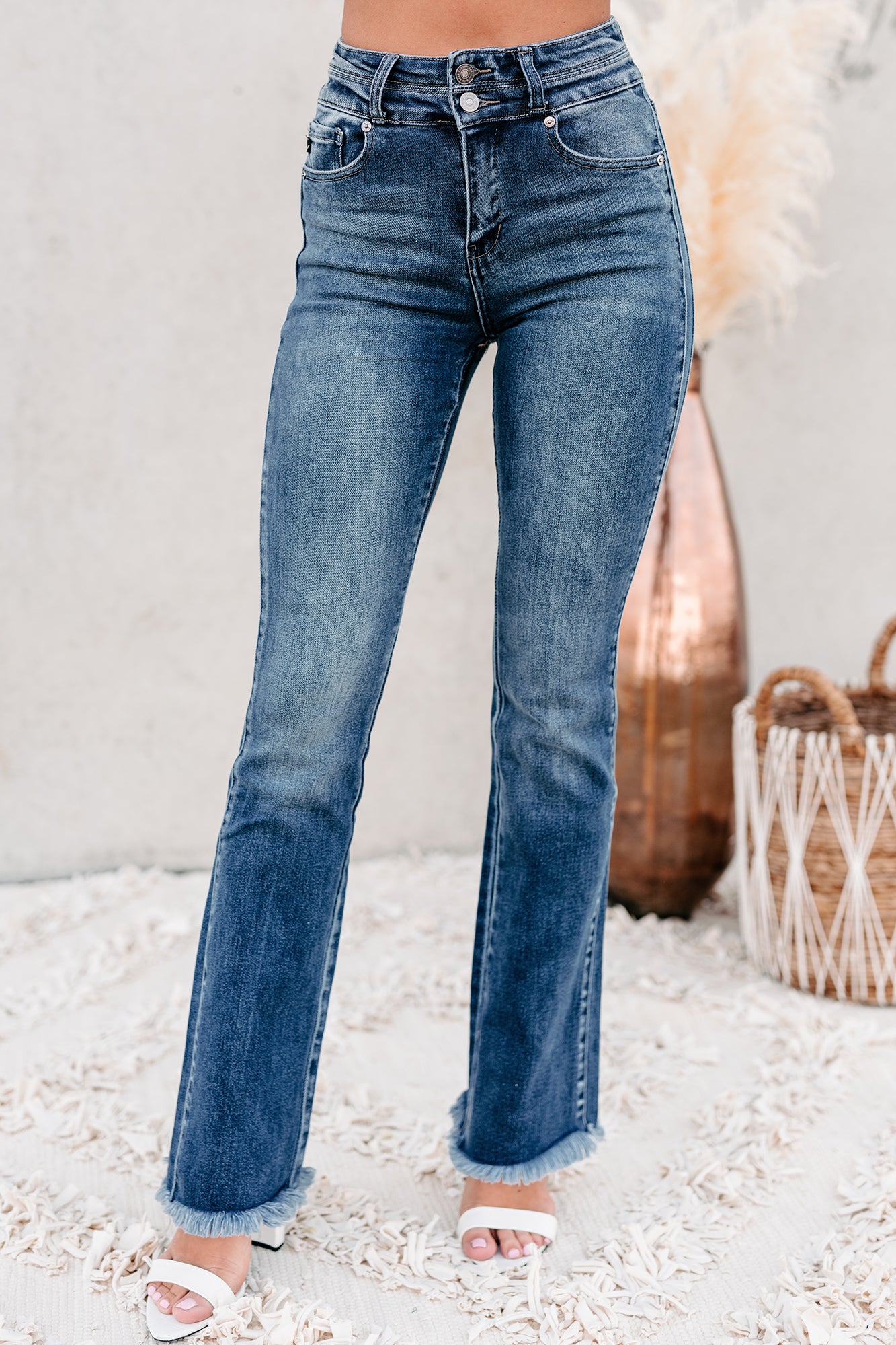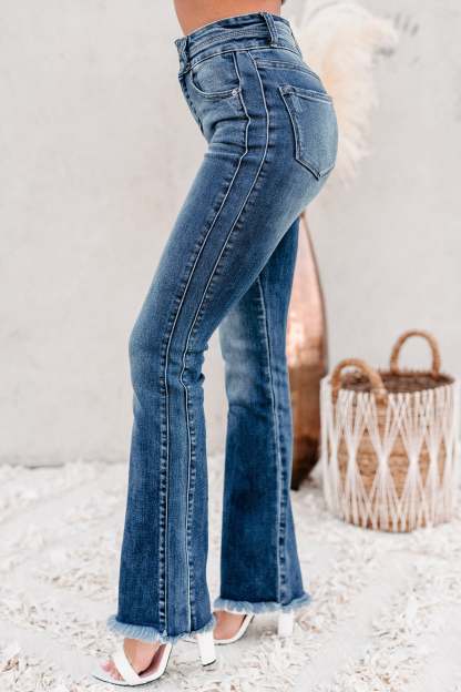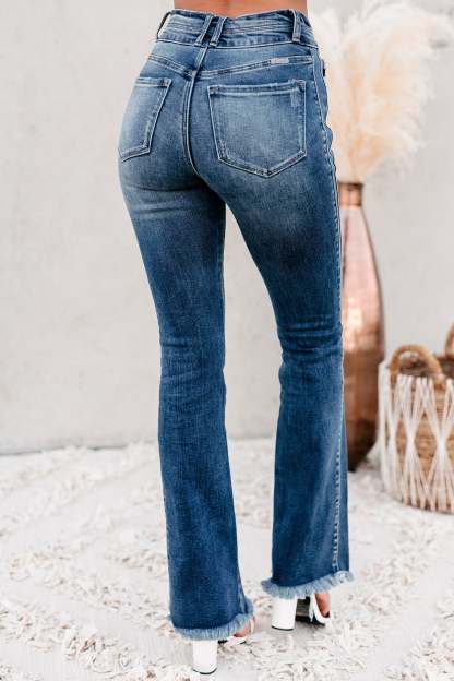 Look Cute For Any Occasion In These Medium Wash. High Rise. Frayed Hem. Boot-Cut Jeans!