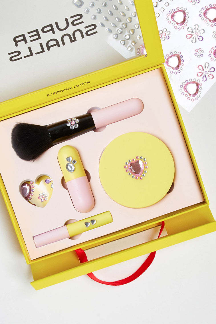 Inspired by the mischievous fun of raiding Mom's makeup drawer. the Mom's Makeup Play Set gives kids the joy of their very own versions! Featuring REAL makeup for kids. the products are safe for play and little one's skin. The set includes a clear mascara. clear lipstick. pale pink blush. and blush brush—plus. gem stickers for decorating the compact and tubes. It's a craft. a toy. and a dress-up must-have all in one!