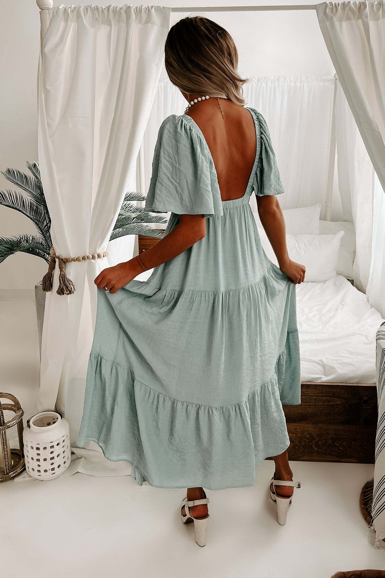 Sweet Girl Ruffle Sleeve Tiered V-Neck Maxi Dress (Sage Blue)