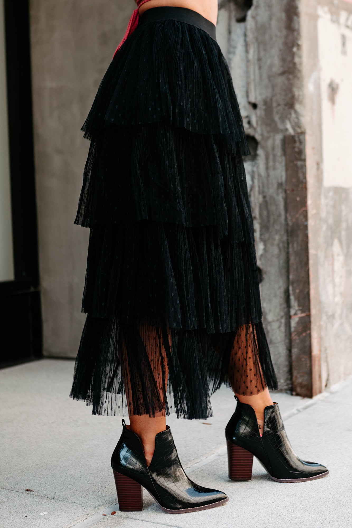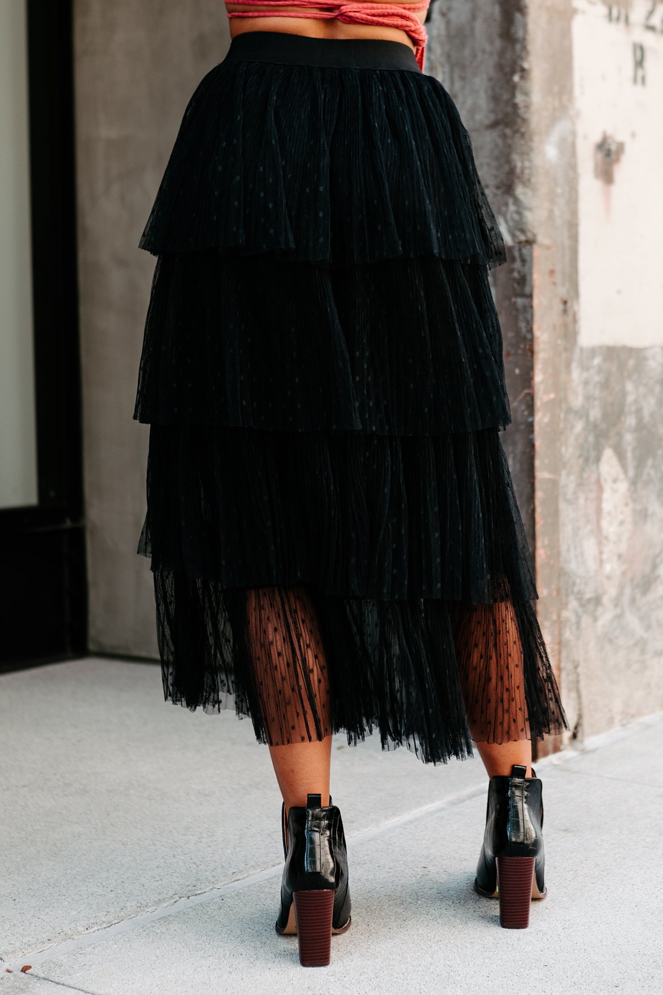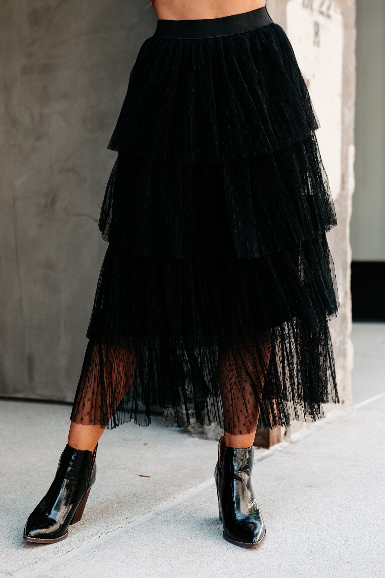 Show Some Personality In Your Style With This Black. Dot Print. Tiered. Tulle Midi Skirt!