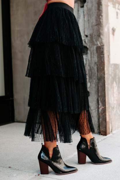 Take A Bow Tiered Tulle Midi Skirt (Black)