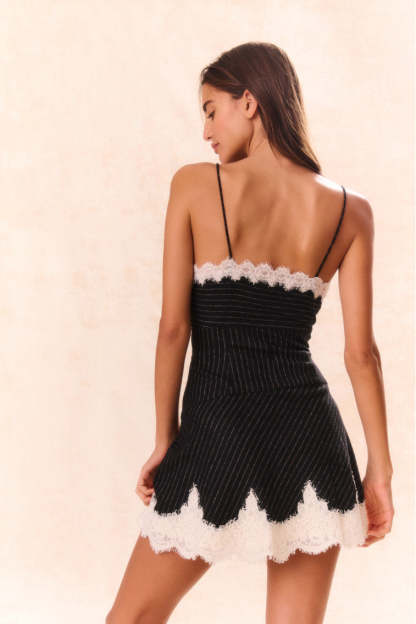 Put on the pretty with the Teddi Dress. This flirty mini is part of our menswear-inspired pinstripe wolf suiting group and is all about the striking contrast between the pinstripe print and vintage-inspired laces. Feminine and flattering. the playful piece begins with spaghetti straps with a lace-adorned neckline. an empire waist. and a yoke that fits to the body that releases into an airy. A-line skirt. The hem stuns with sweeping scalloped lace to finish the beautiful piece. A side zipper is included for functionality. Pair it with our Icarus Jacket to complete the look.