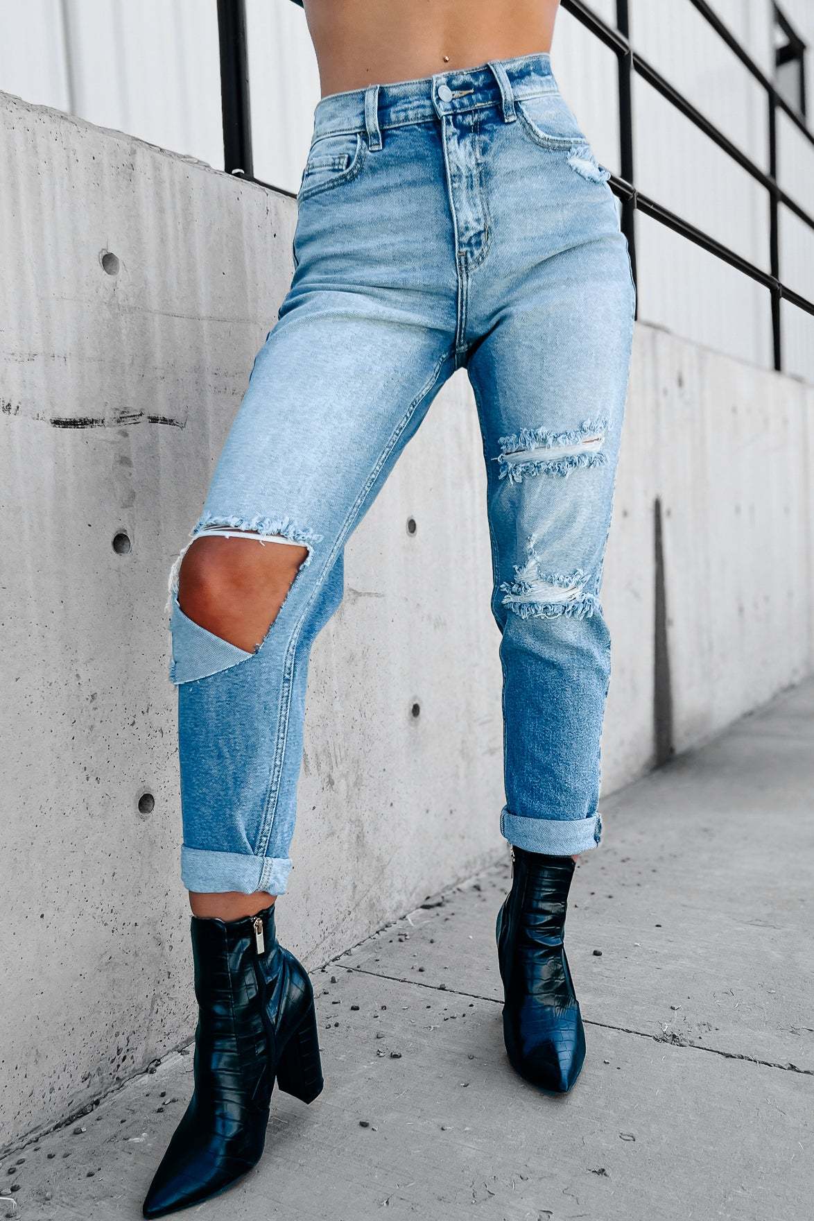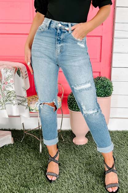 Add A Little Edge To Your Outfit With These Light Wash. Knee Cut Mom Jeans!