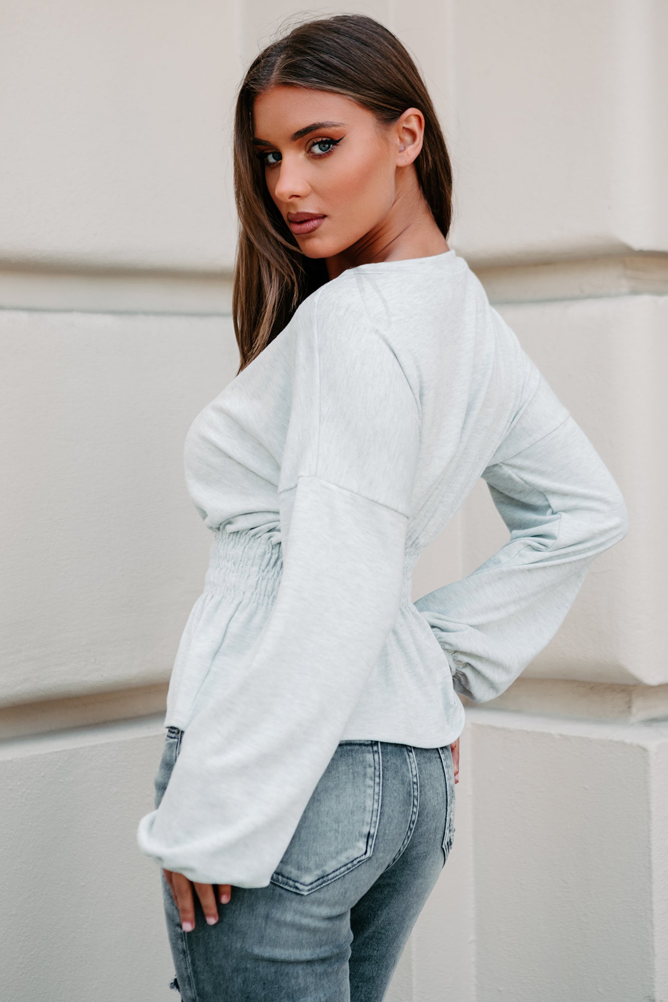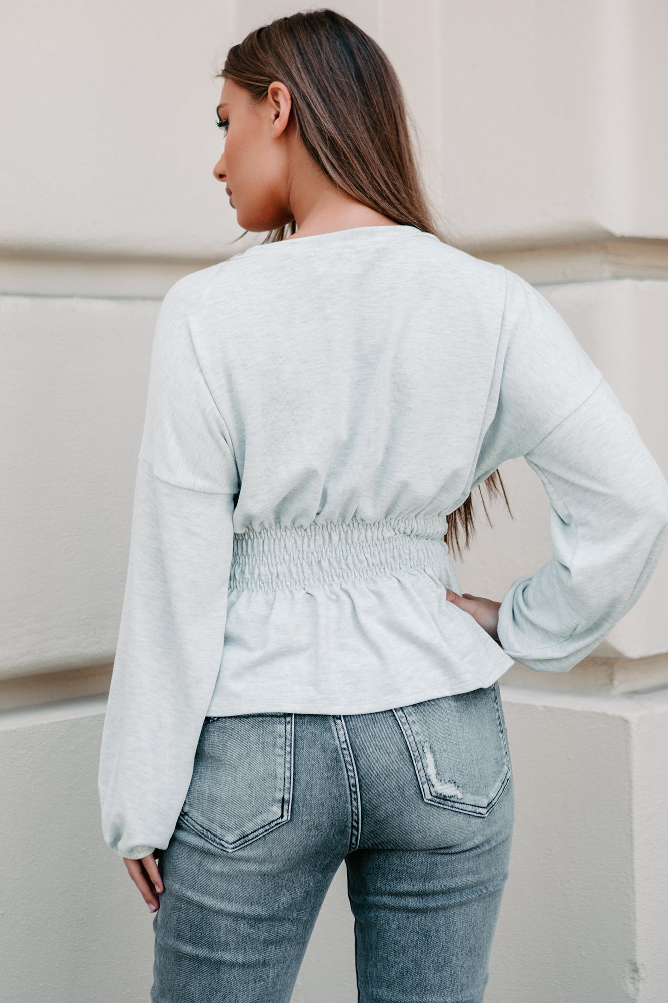 Feel Comfy But Look Chic In This Light Heather Grey. Long Sleeve. Smocked Waist Top!