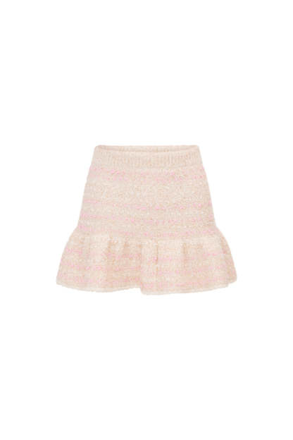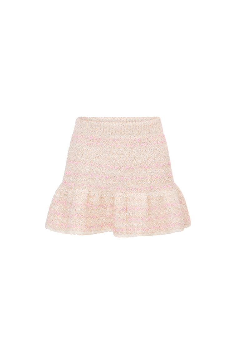 Introducing the Velman Skirt. This fall mini features a sequin yarn mixed with a boucle yarn creating a stunning. dynamic dimensional texture. The charming mini has a slim fit through the waist and him. soft elastic encased on the waistband for ease. and a sweet ruffle flounce at the hem. Pair with the Blanca Cardigan for a full set.