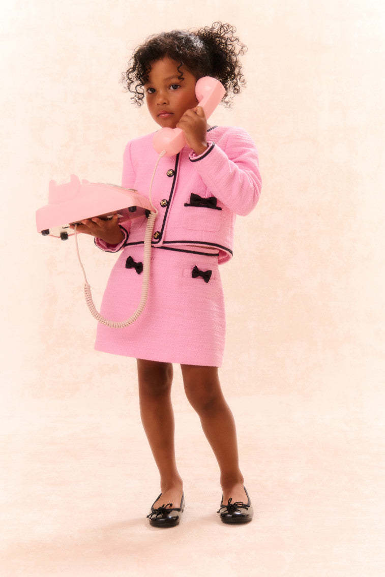 Preppy and posh in the Verita Skirt. This pretty. made-to-match skirt stuns with a crisp. tweed fabric. contrasting details. and tiny bows on the faux pockets. Pair with the Mahoney Jacket for a full set.