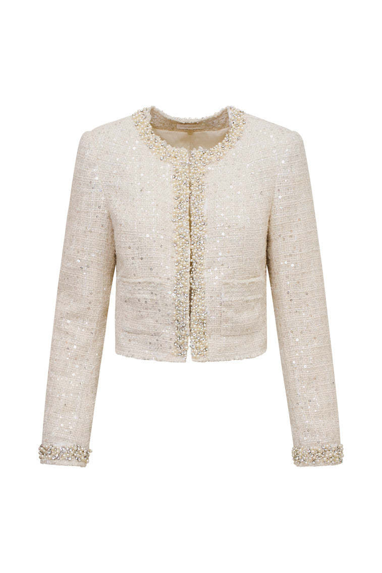 Channel New York chic in the Vintra Jacket. This elevated layer is designed from a textural tweed fabric with delicate. tiny sequins woven through for added texture and that signature OhMollys shimmer. Pearl and rhinestone encrusted embellishments line the neckline for added detail. The jacket takes on a preppy shape with small pockets at the waist. a slim fit silhouette. and a hook-and-eye closure down center front. Pair it with the Wendina Skirt.