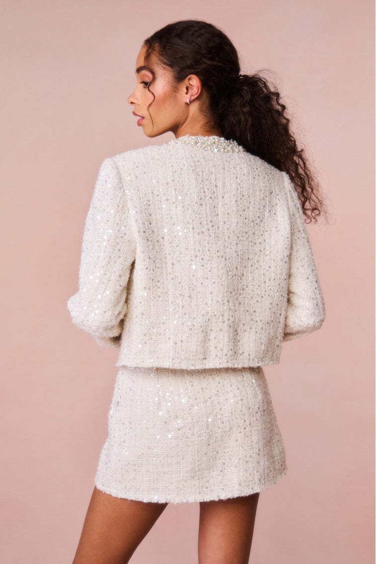 Introducing the Wendina Skirt. This Upper East Side-inspired mini skirt is designed from a textural tweed fabric with delicate. tiny sequins woven through for added texture and that signature OhMollys shimmer. The a-line mini debuts with two pocket patches. each encrusted with pearls and rhinestones. The edges are frayed for an added flair. Pair with our Vintra Jacket for a full set.