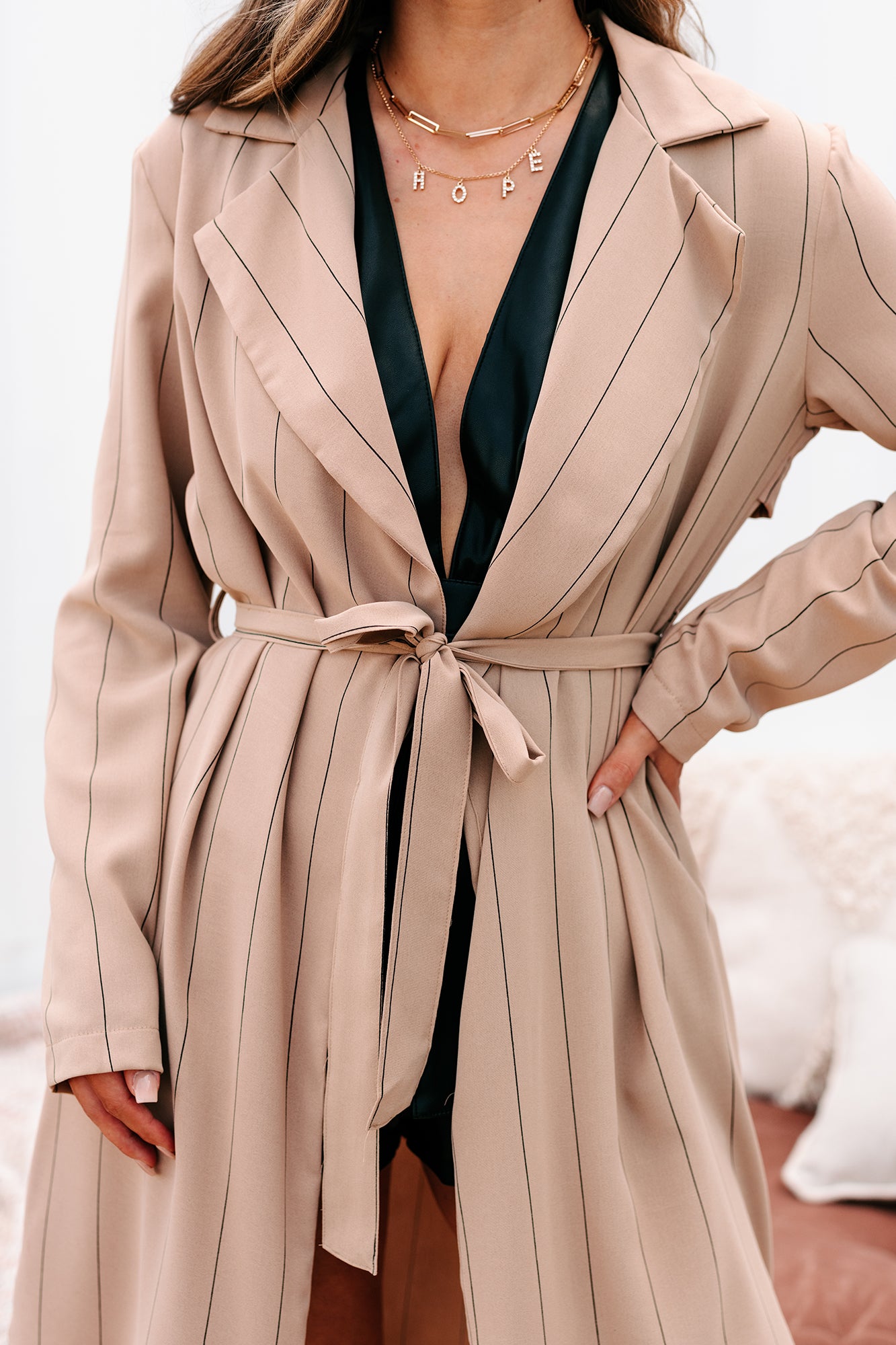 This trendy taupe & black striped jacket features a subtle stripe pattern. & a self-tie belt closure that is removable!