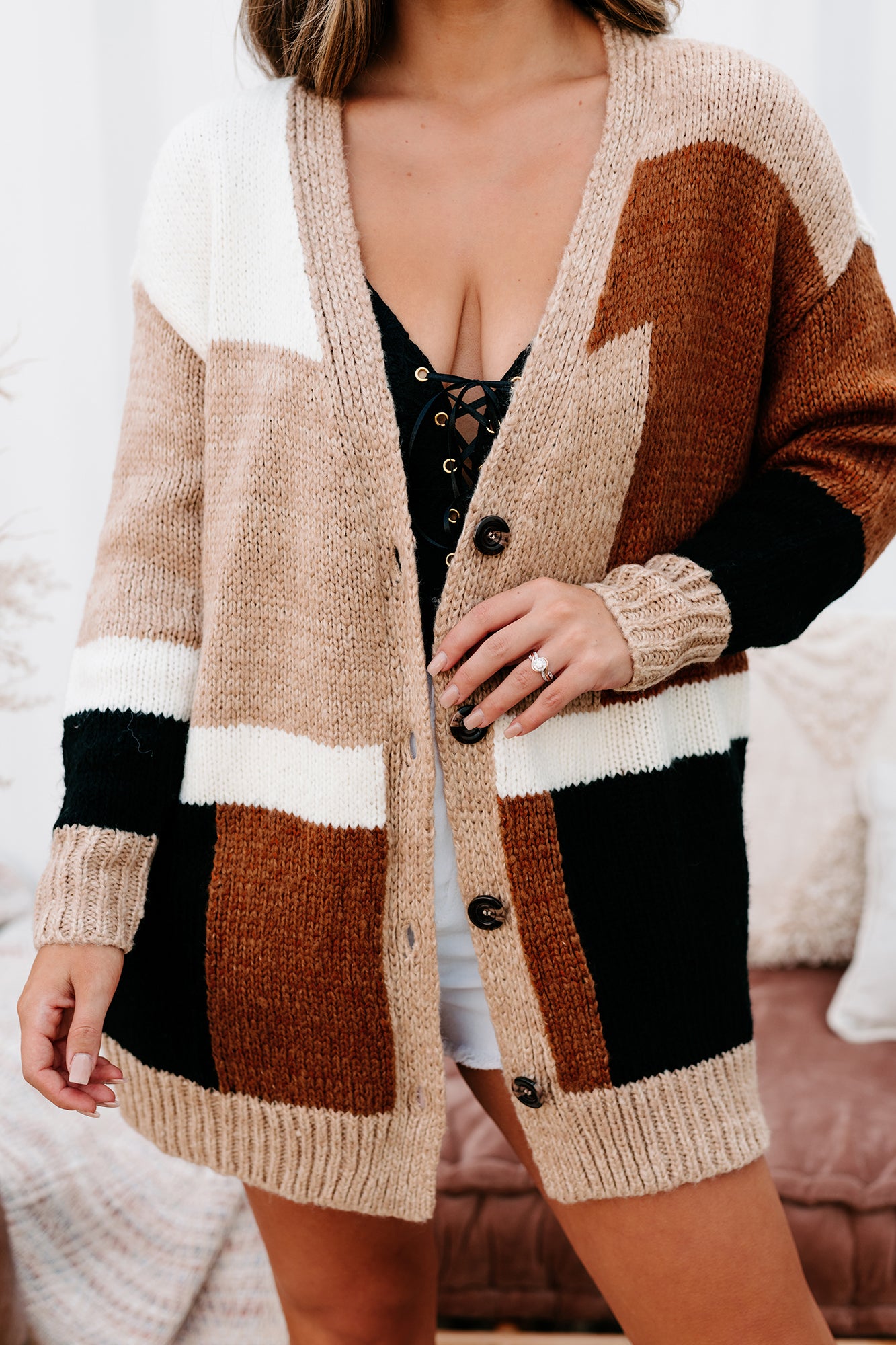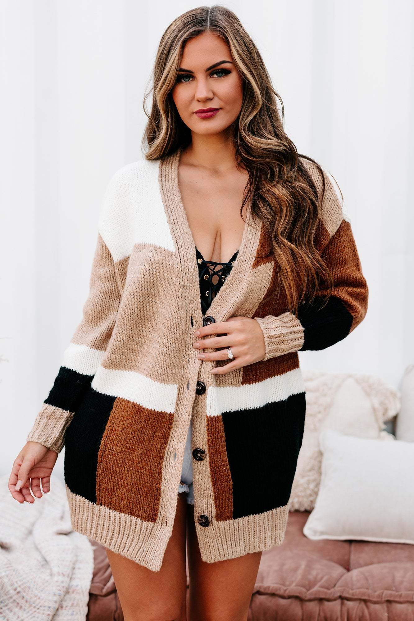 Look Cute & Feel Warm With This Caramel Multi. Color Block Cardigan!