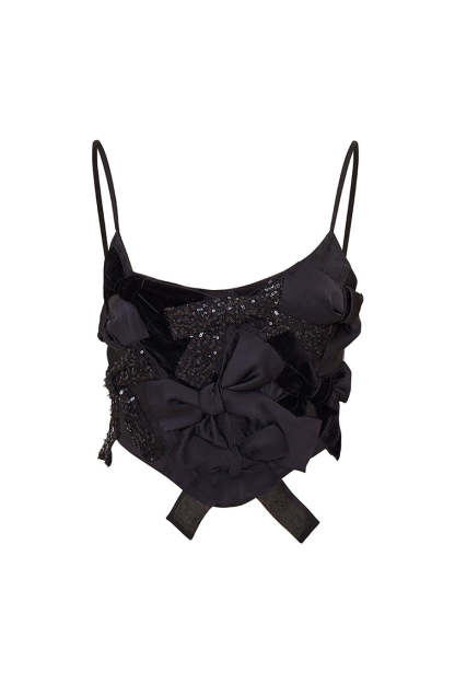Introducing the Woodley Top. This playful. satin bustier top is a dream come true with a medley of bows designed from mixed fabrics hand-appliqued and placed in a beautiful arrangement showcasing a stunning blend of textures and tonal colors – from sequins to tulle. charmeuse. organza. and velvet. The feminine piece has a flattering silhouette due to boning. spaghetti straps. and is finished with a zipper on the back.