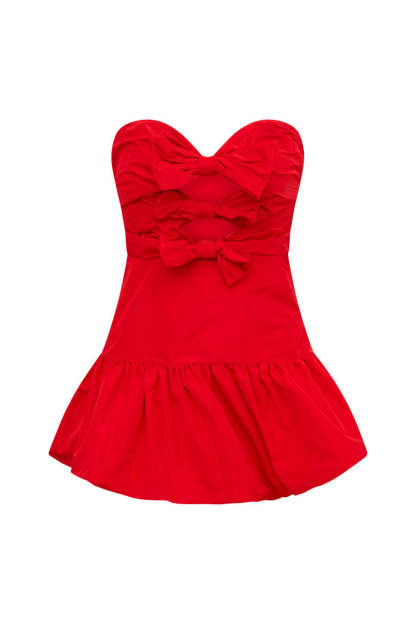 Introducing the Woodlow Dress. Designed from a lovely taffeta fabric. this festive and flirty strapless mini features a bustier bodice with three tied bows draped at center front and cutouts for added playfulness. This piece includes gripper tape at the chest for a supported and comfortable structure.