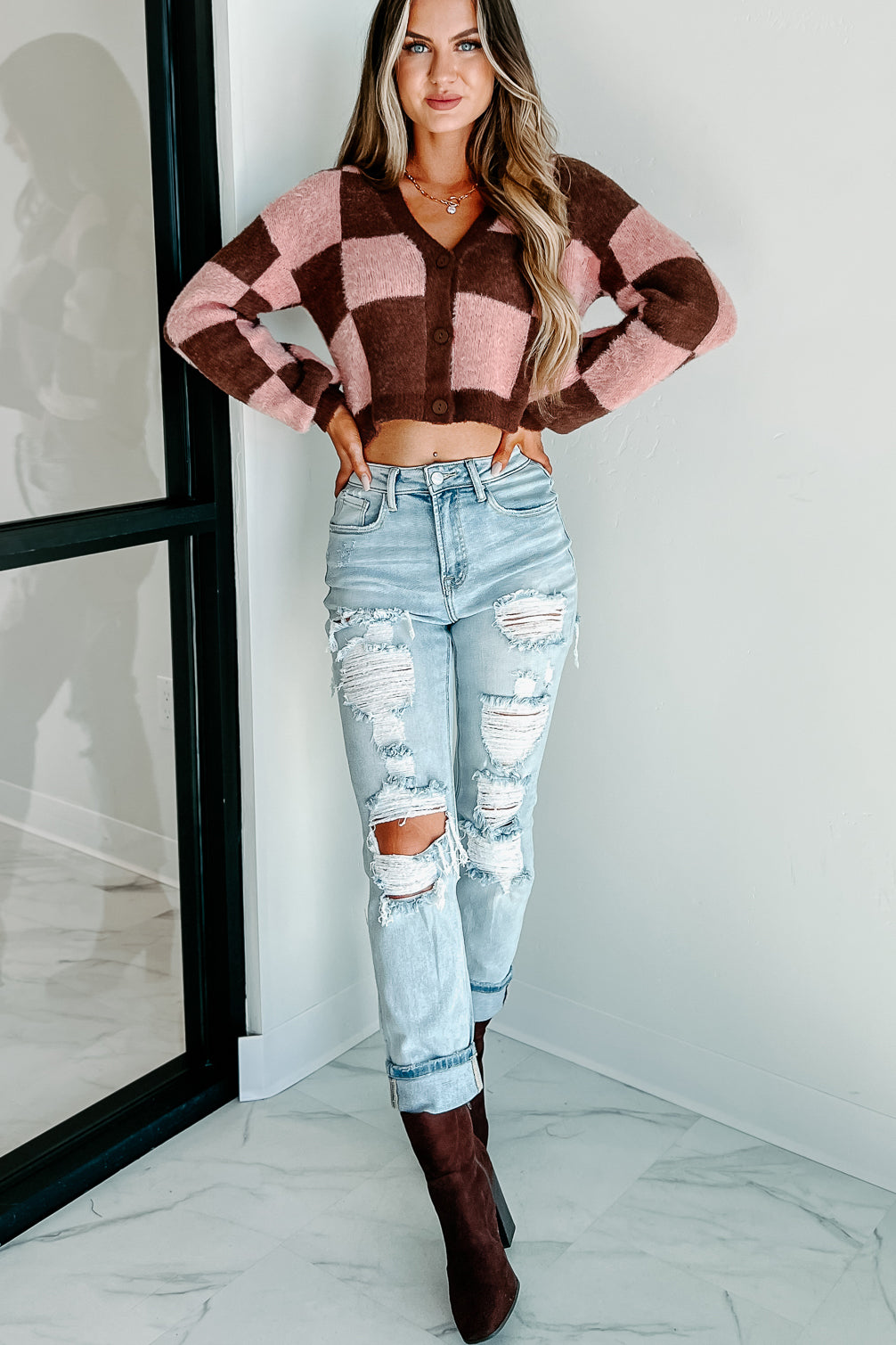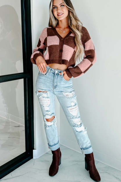Your Best Bet Checkered Sweater Cardigan (Brown/Pink)